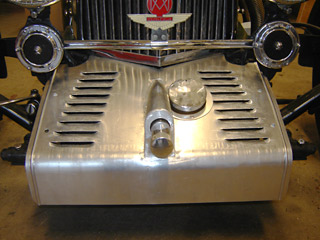 Aus den Folgen eines kleinen "Anlehnens" in der Frontpartie wurde das Frontabdeckblech dieses fast 80-jährigen Fahrzeugs leicht gestaucht. Das über die Jahre schon etwas porös gewordene Aluminiumstück wurde deshalb komplett neu angefertig und das bestehende Blech dem Fahrzeug beigelegt.