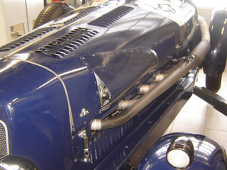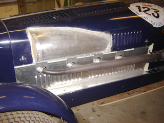 Die provisorische Vergaserausbuchtung wurde nach Originalvorlagen neu angefertigt und auf die bestehende Motorabdeckklappe genietet. Das Seitenblech unten wurde ebenfalls neu angefertigt und der Auspuffanlage angepasst.