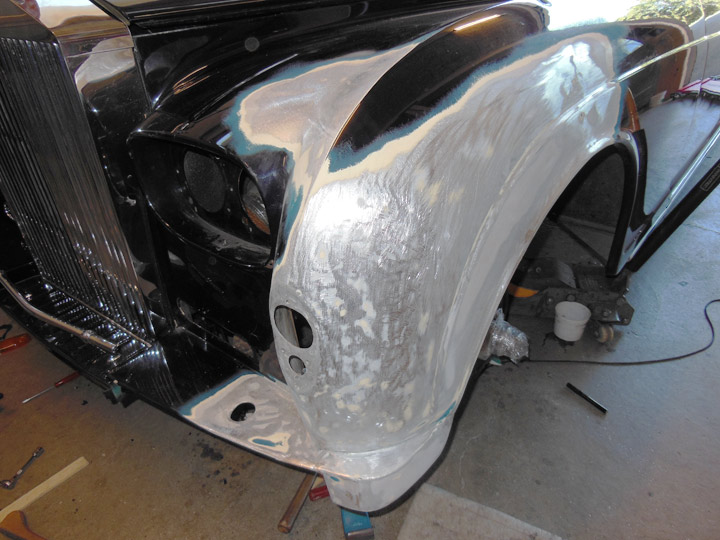 Der beschädigte Kotflügel wurde komplett freigelegt rückverformt und ausgeschlichtet. Im Interesse eines möglichst kleinen Eingriffes in dieses wunderschönen Auto und dessen bestehender Pantina wurde repariert und nicht ersetzt.