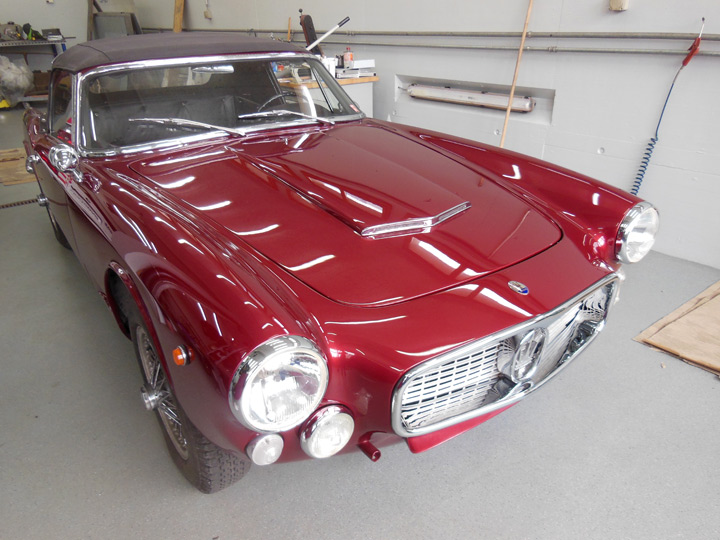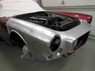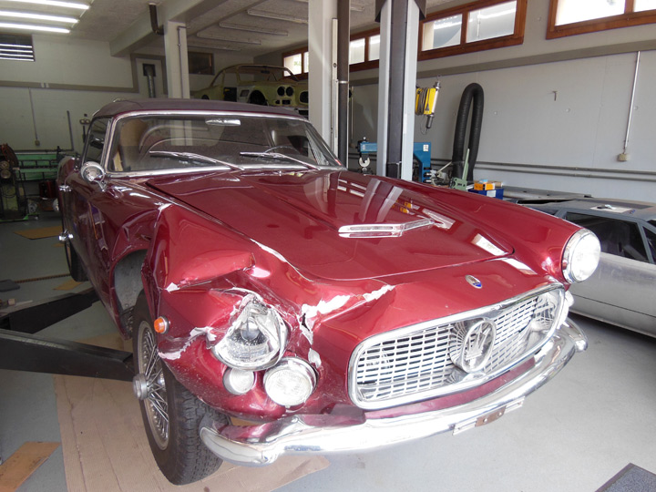 Der durch eine Kollision verursachte Frontschaden rechts wurde soweit wie möglich rückverformt um die Originalsubstanz weitgehend zu erhalten und wieder zu verwenden. Die nicht wiederherstellbaren Abschnitte wurden neu angefertigt, eingepasst und stumpf eingeschweisst. Stosstange und defekte Beleuchtungsteile wurden ersetzt.
