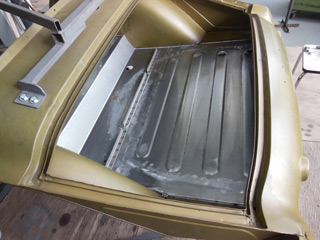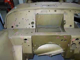 Als erster Schritt wurde das Chassis komplett saniert, diverse Beulen und Roststellen wurden behoben. Anschliessend wurde das Chassis neu lackiert und befindet sich jetzt bei Classic & Vintage Cars AG zum kompletten Neuaufbau der Mechanik. Bei der Carrosserie wurde wie immer mit dem Aufbau auf Rangier- und Arbeitstraversen sowie der Versteifung der Carrosserie begonnen, um eine saubere Arbeitsbasis zu schaffen. In der Folge wurde zuerst die Spritzwand saniert, was beudeutet, dass diese zu einem wesentlichen Teil neu angefertigt wurde. Anschliessend wurde die gesamte Bodengruppe ersetzt. Der vordere Bereich wurde mit handelsüblichen und von Hand angepassten Reparaturblechen ersetzt. Der Bereich von Hinterachse und Kofferraum wurde komplett neu angefertig.