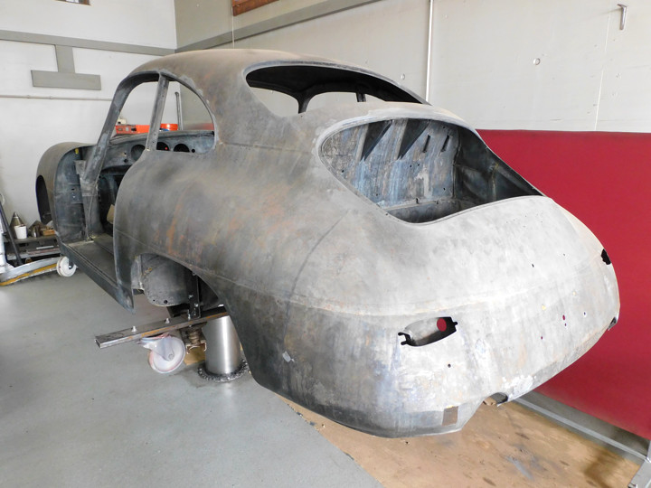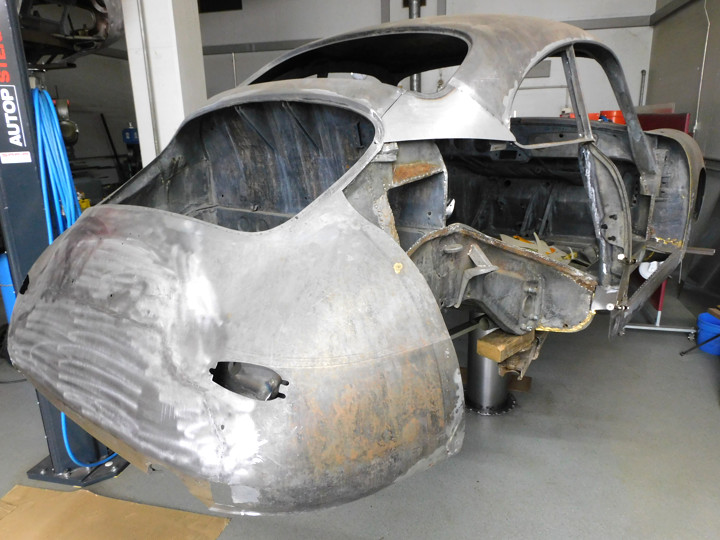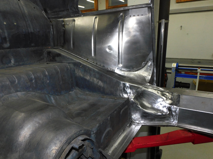 Auch hier konnten wir die Carrosserie komplett zerlegt übernehmen. Somit sind die ersten Schritte immer identisch: Rangier- und Arbeitstraversen montieren und ab zu Meier Rafz. Auf die Grundierung wurde verzichtet, da der grösste Teil repariert werden muss. Aus diesem Grund wurde einfach passiviert. Den Einstieg in die Restaurierung starteten wir im Heckbereich mit Heckblech austrennen und neu anfertigen. So war auch die Zugänglichkeit für die Arbeiten an den Innenbleche gegeben.